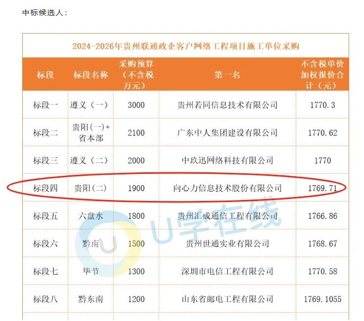 2024年12月底,2024-2026年貴州聯(lián)通政企客戶網(wǎng)絡(luò)工程項(xiàng)目施工單位采購(gòu)公布了中標(biāo)結(jié)果,向心力信息技術(shù)股份有限公司中標(biāo)標(biāo)段四,中標(biāo)金額1900萬(wàn)元(不含稅)。服務(wù)內(nèi)容主要包括政企客戶專線的新建擴(kuò)容、改造、零星整治等施工。