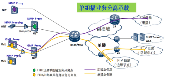 總體上,互聯(lián)網(wǎng)電視業(yè)務(wù)采用點(diǎn)播、直播分離承載方式構(gòu)建網(wǎng)絡(luò)解決方案,其中點(diǎn)播業(yè)務(wù)采用“單播+CDN”模式構(gòu)建,直播業(yè)務(wù)采用組播技術(shù)構(gòu)建;單播、組播業(yè)務(wù)從業(yè)務(wù)流程上完全分離,相互不存在影響。