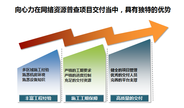 向心力公司針對(duì)通信服務(wù)商網(wǎng)絡(luò)資源現(xiàn)狀,推出了網(wǎng)絡(luò)資源普查服務(wù),能夠很好的解決上述問(wèn)題,既保證了項(xiàng)目交付的質(zhì)量和進(jìn)度,又能夠和運(yùn)營(yíng)商搭建統(tǒng)一的溝通平臺(tái),方便運(yùn)營(yíng)商的管理。