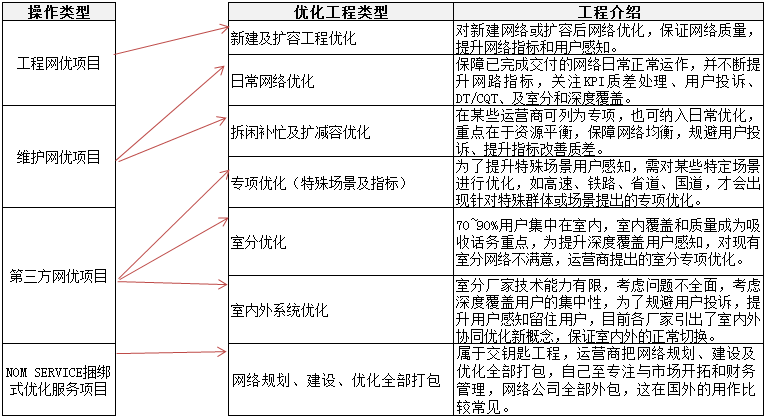 ? 網(wǎng)絡(luò)優(yōu)化維護:是指在設(shè)備完好基本上,借助于測試工具和分析軟件,對無線設(shè)備進行日常優(yōu)化,提高網(wǎng)絡(luò)服務(wù)質(zhì)量,提高用戶感知度。處理日常用戶投訴等。