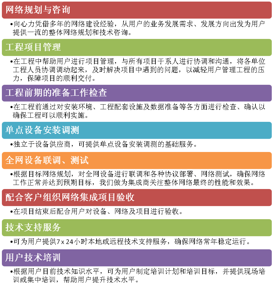 我公司多年來一直從事數(shù)通、傳輸、接入網(wǎng)、核心網(wǎng)、無線、業(yè)軟等運營商全產(chǎn)品的技術(shù)服務(wù),公司在各種產(chǎn)品擁有多名專家。在為用戶規(guī)劃網(wǎng)絡(luò)、優(yōu)化網(wǎng)絡(luò)到交付網(wǎng)絡(luò)、維護網(wǎng)絡(luò)的全過程我們都可以發(fā)揮全產(chǎn)品優(yōu)勢,為用戶打造承載全業(yè)務(wù)的精品IP網(wǎng)絡(luò)。